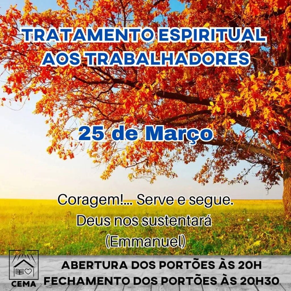 No dia 25 de março, o CEMA realiza um tratamento espiritual especial para trabalhadores, com reflexões evangélicas, passe magnético e atividade mediúnica. É uma oportunidade para se conectar espiritualmente, encontrar força e seguir em frente com fé, em um momento de fraternidade e reflexão.