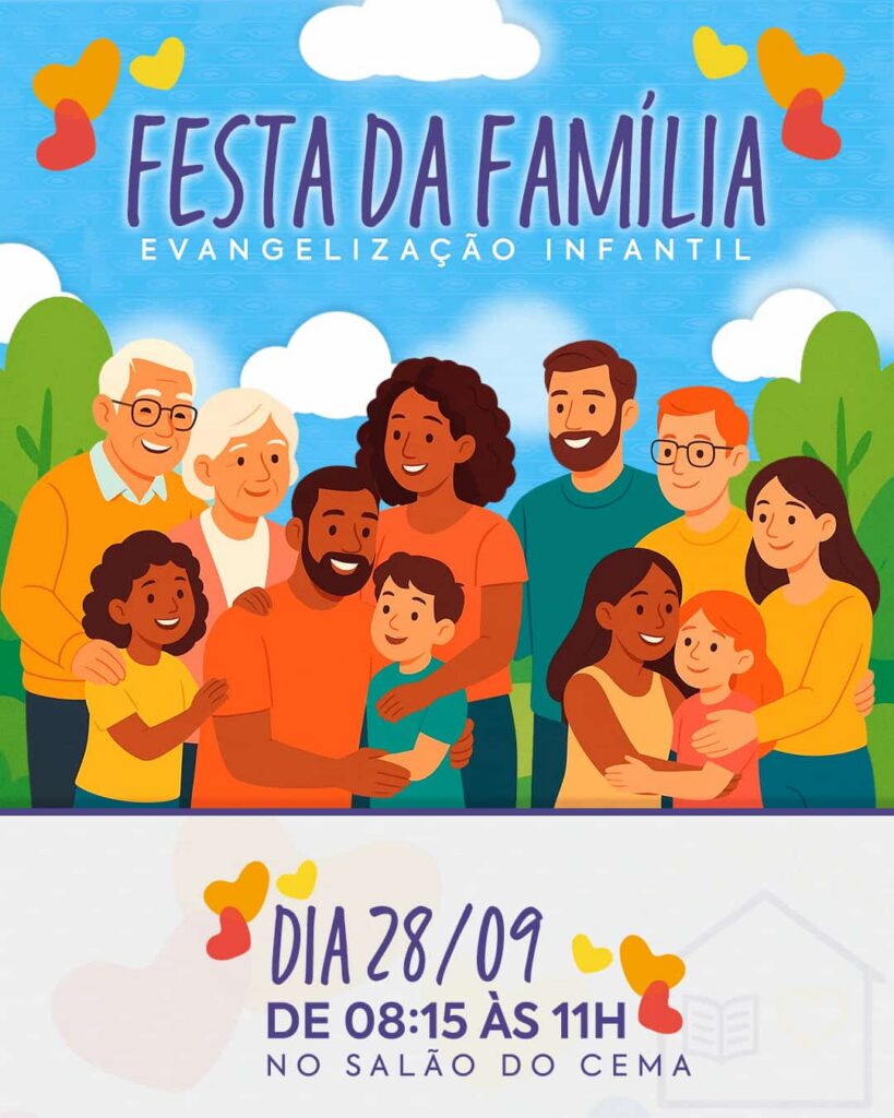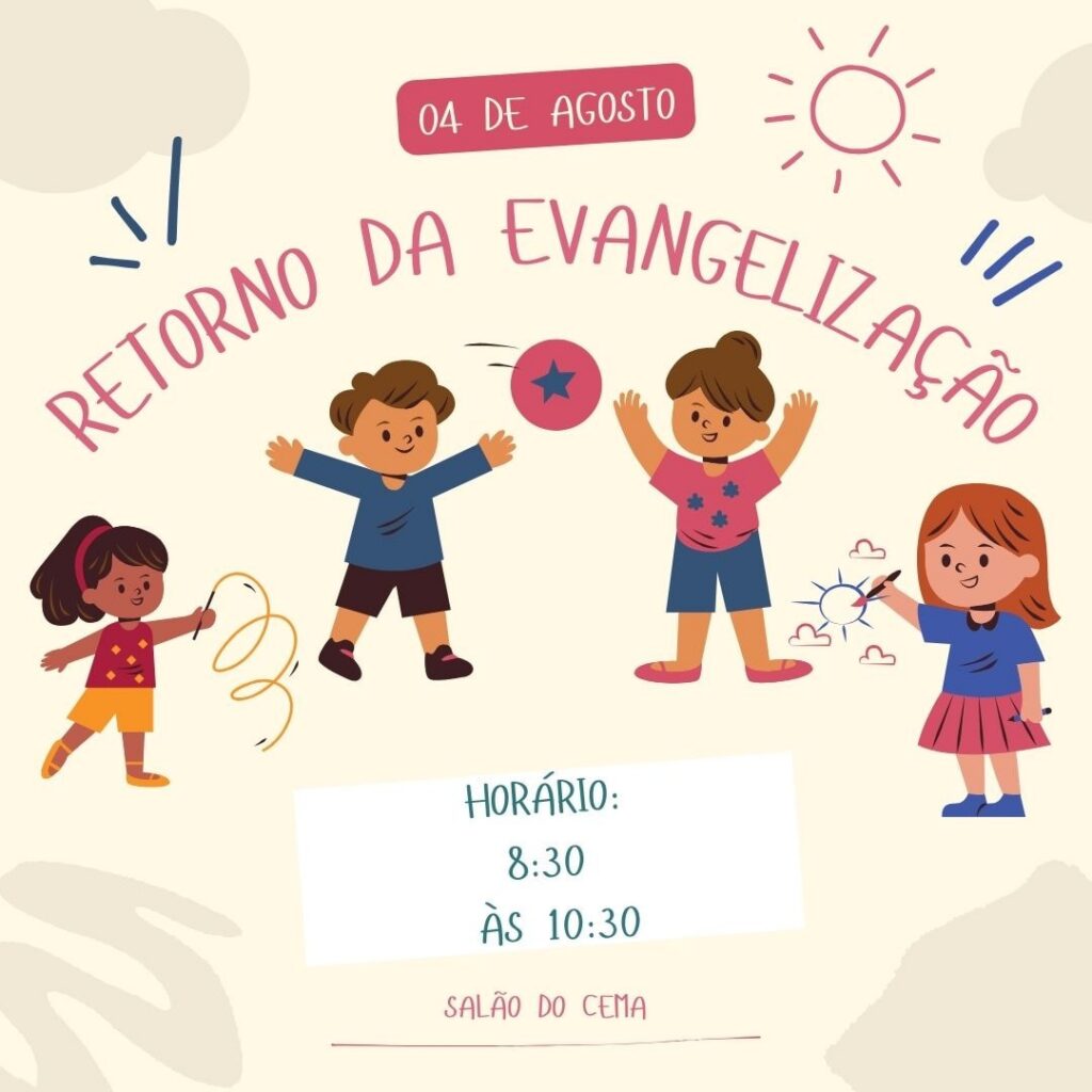 Atenção, famílias! Nosso retorno chegou! Neste domingo, 01/03, a partir às 8h30, no salão do Cema, estaremos prontos para dar início à nossa Evangelização Infantil! E sabe o que vai deixar tudo ainda mais mágico? Contação de histórias com a *Conta Lelê!* Será uma manhã cheia de alegria, aprendizado e muito amor, vivendo os ensinamentos […]
