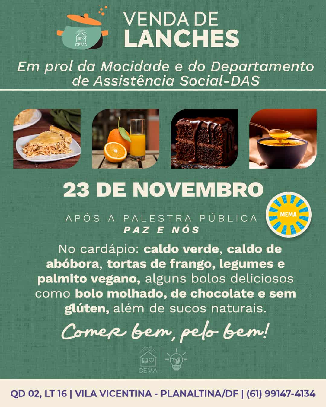 No próximo domingo, 23 de novembro, após a palestra pública “Paz e Nós”, teremos uma deliciosa Venda de Lanches em prol da Mocidade Espírita Maria Madalena (MEMA) e do Departamento de Assistência Social (DAS).