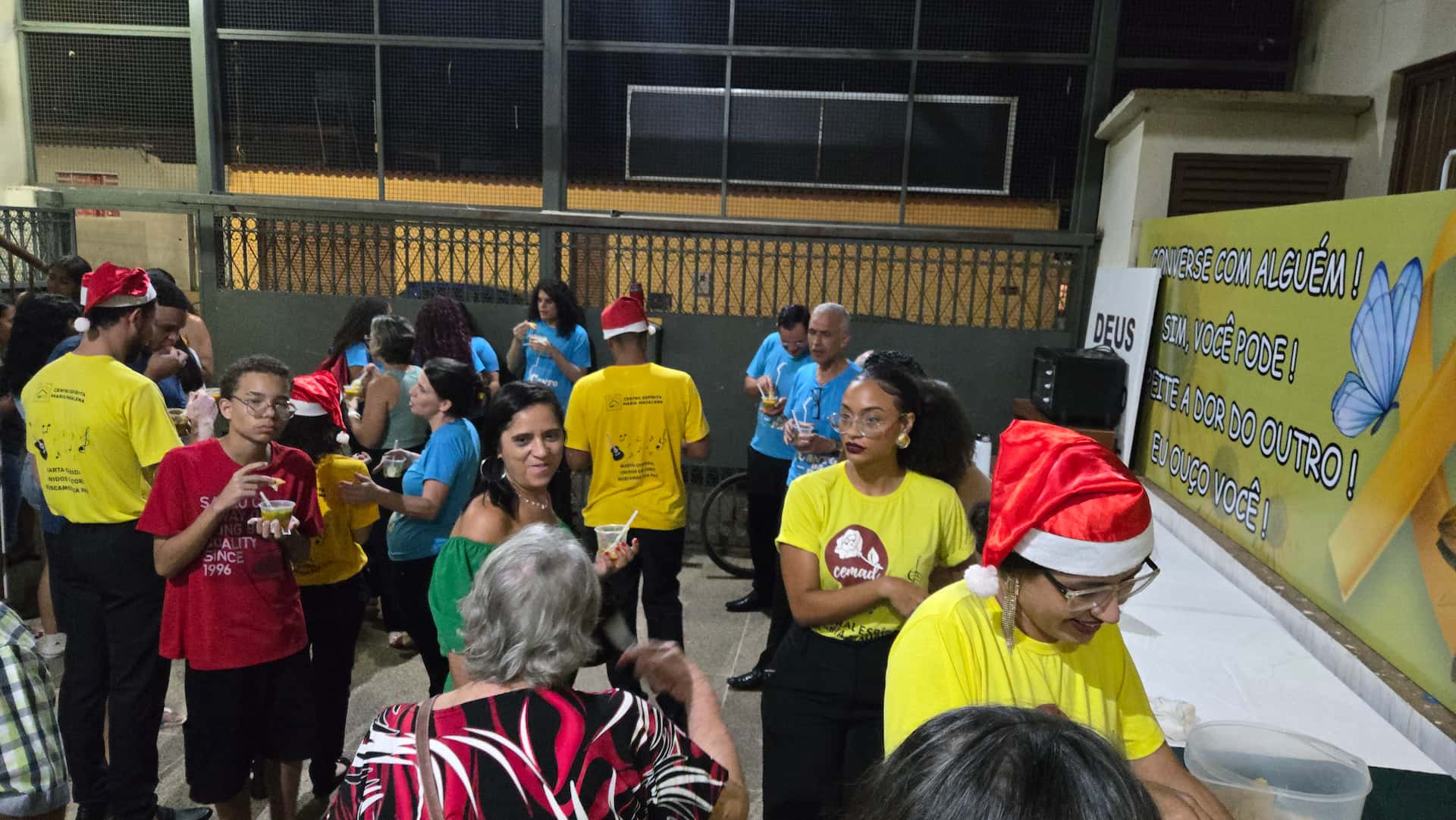 Ao final da cantata, o clima de união e alegria se estendeu para além do salão. Todos foram convidados a se dirigir ao pátio do CEMA, onde aconteceu um momento especial de confraternização, com boas conversas, sorrisos e a partilha de deliciosas comidas preparadas com carinho. Foi um encerramento leve e acolhedor, marcado pela descontração, pela alegria e pelo fortalecimento dos laços fraternos, reafirmando que o Natal também se vive na convivência simples e sincera entre irmãos.