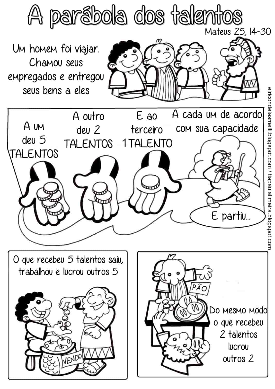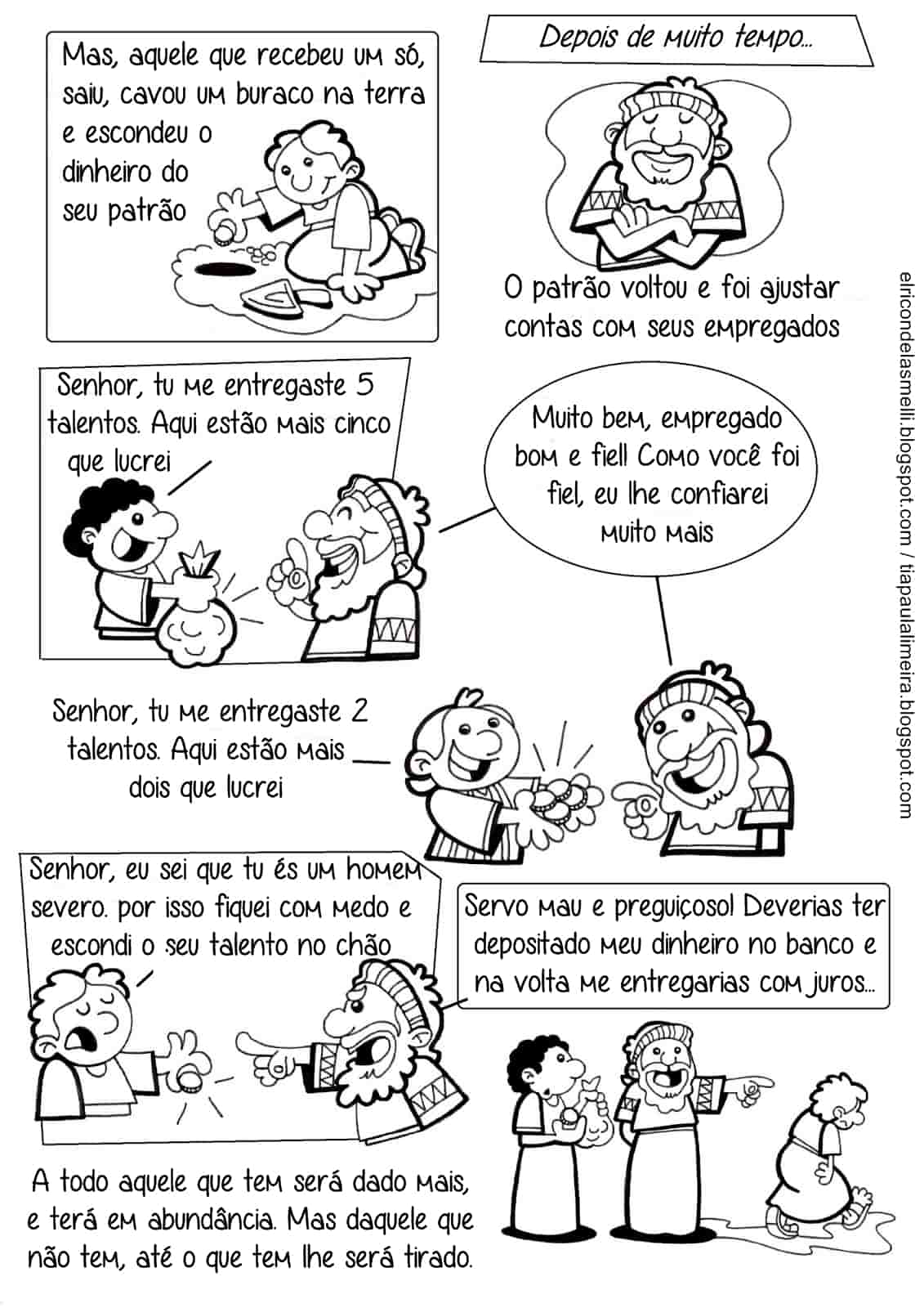 Na parábola de Jesus, narrada pelo evangelista Mateus (25:14-30) e que também é foco de estudo em O Evangelho Segundo o Espiritismo, capítulo XVI, encontramos uma história emblemática em que um senhor, antes de uma viagem, reúne três servos e confia a cada um deles uma quantia monetária, os chamados talentos: o que recebeu cinco e ganhou mais cinco; o que recebeu dois e ganhou outros dois; e o que recebeu um, que, com medo, o enterrou. A resposta do senhor aos dois primeiros é idêntica: “Bom e fiel servidor, compartilha da alegria do teu senhor.” Ao terceiro, porém, dirige palavras duras: “Servidor mau e preguiçoso”.
